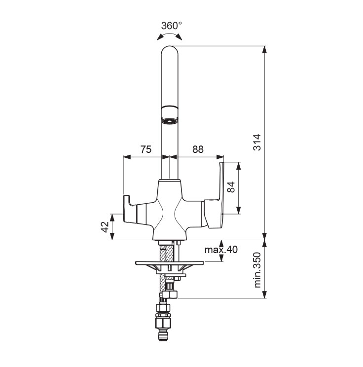 VIDIMA UNO Смеситель для кухонной мойки с клапаном для подключения фильтра, система облегченного монтажа StrongFix, трубчатый поворотный излив 207 мм, угол поворота 360˚, аэратор PERLATOR с 2-мя выходами (центральный – для фильтрованной воды, по окружности - для нефильтрованной воды), керамический картридж 35 мм и кранбукса на ½ для включения/выключения фильтрованной воды, металлическая рукоятка (обе), индикатор холодной/горячей воды,  гибкая подводка 2xG1/2" + универсальное подключение для фильтрующей системы, шланги стандартной длины 400 мм